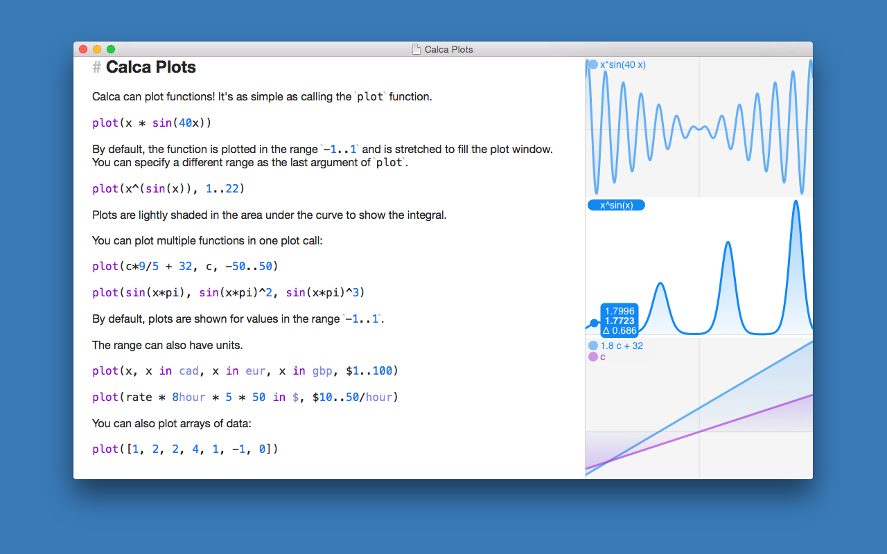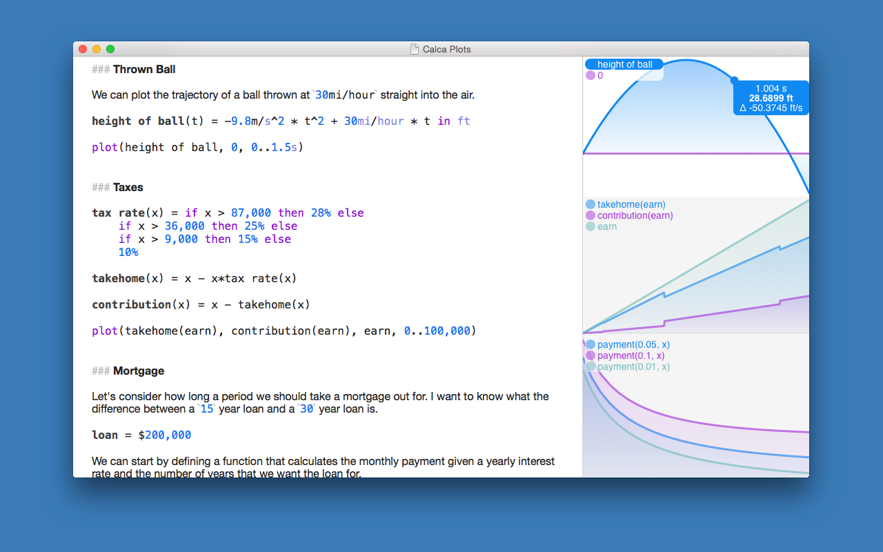 Calca 1.5.1 April 27, 2021 , Application, Productivity Name: Calca_1.5.1_MAS__HCiSO_Mactorrents.io.dmg Size: 7.5 MB Files Calca_1.5.1_MAS__HCiSO_Mactorrents.io.dmg[7.5 MB] Download Calca is a powerful symbolic calculator that updates as you type giving you instant answers. It solves equations and simplifies complex expressions. It’s also a rich Markdown text editor so that you can explain your ideas alongside your calculations. Calca is perfect for professionals and students – anyone who works with numbers and equations. Variables and functions can be created with only a few keystrokes and can be manipulated with a rich library of operators and functions. Calca updates as you type – just like a spreadsheet. You can declare variables, edit their values and watch everything update before your eyes. Since everything is calculated on the device – no network needed – you get answers instantaneously. All calculations are stored as plain text so you can easily share them with other editors and move them from device to device. Calca has been designed to work with iCloud documents so all your devices can access your calculations – you’ll always have the latest files ready for viewing and editing. Calca comes with a suite of examples to help you get started covering topics from home mortgages to kinetics. All these examples are fully explained within Calca itself. Are you still using a desktop calculator? Are you using the silly calculator with the giant buttons that came with your OS? Computers are much more capable than doing simple one-line arithmetic – put your machine to work with Calca! Calculation Features: • Variables `x = 42` • Functions `f(c) = 9/5*c + 32` and even recursive functions • Units `42 mph in kmph` and currency `¥599 in $` • Solves equations (`x + 2x + 4x = 42`, what is x?) • Matrices with inverses so you can solve linear equations • Sum, prod, map, and reduce operations on lists, matrices, and ranges • Trigonometry and complex numbers • Derivatives of functions • Logic operations and if statements • Binary math (& and |) and support for binary and hex number (`0xA9` and `0b1010`) • Keeps track of units (m, s, m/s, m/s^2, etc.) so you can verify your equations as you computer Compatibility: OS X 10.9 or later Mac App Store https://apps.apple.com/app/calca/id635758264 Screenshots