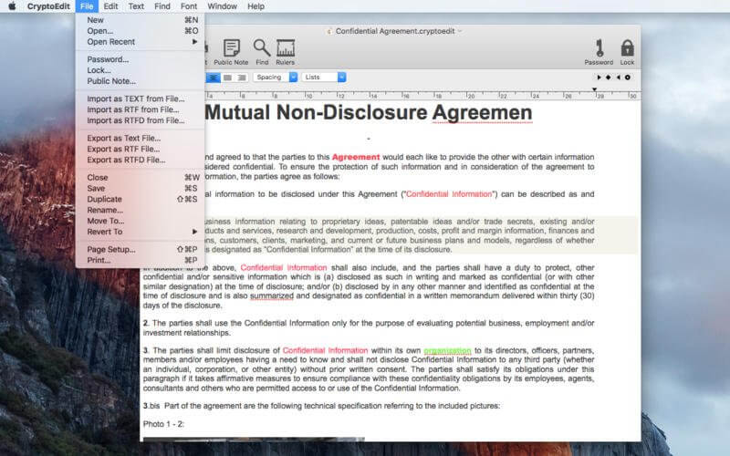 CryptoEdit 2.4 April 2, 2021 , Application, Productivity Name: CryptoEdit_2.4__TNT_Mactorrents.io.dmg Size: 9.01 MB Files CryptoEdit_2.4__TNT_Mactorrents.io.dmg[9.01 MB] Download CrytoEdit is an absolutely simple, powerful, and secure application to create and edit documents that are encrypted by default. It handles TEXT, RTF, and RTFD (RTF with images) files. All files are saved encrypted. It is the ideal solution for managing private documents in plain text and RTF. CryptoEdit allows you to edit documents with a simple word processor. It can handle text and images. All the features available in a modern, Cocoa-based RTF editor are available in CryptoEdit. Text may be formatted using rulers, styles, and fonts of different sizes and colors. All font selections are available from standard menu dialogs and custom styles may be used. CryptoEdit performs spell-checking in your native language and includes full text search. Insertion of images may be done with simple drag-and-drop. CryptoEdit can import existing documents and export in standard TEXT, RTF, and RTFD. CryptoEdit documents are always saved encrypted for security. If it was saved, it was encrypted! Saving a document with images (RTFD) creates a single file with all text and images encrypted. Always saves content encrypted. You are always safe because it can’t save in plain text. No way to create documents that anyone can read. Easy and effective, you will be productive from the first seconds of use Accepts drag and drop to insert images Import from files on disk in standard TEXT or RTF or RTFD (RTF + images) . Documents can also be exported as TEXT, RTF or standard RTFD (included images) in plain format Super-protected content. CryptoEdit uses a strong AES-256 algorithm. Full-featured editor with spell-check in any language Fully implemented search Insertion of images via drag-and-drop. Unbelievably fast. It decrypts and opens super-secure AES-256 files as if they were plain text. Native Intel 64 bit to take full advantage of the power of the latest Macs Sandboxed and Gatekeeper signed respecting all the Apple rules for first class OS X apps What’s New: Version 2.4: Optimized for macOS 11 Big Sur Universal format for Apple silicon and Intel-based Mac Improved (A lot) text appearance in Dark Mode Better text behaviour switching from Dark mode to Classic mode Bug fix Compatibility: OS X 10.10 or later, 64-bit processor Homepage http://www.tensionsoftware.com/osx/cryptoedit/ Screenshots