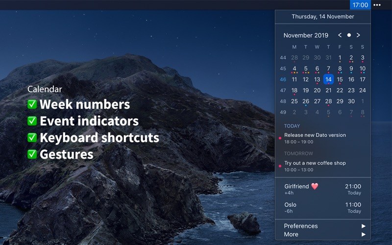 ApplicationApplicationsTools & Utilities Dato 5.7.1 by mac torrent March 9, 2026 March 9, 2026 ( Dato 5.7.1 )Loading... Download Dato gives you a local clock, date, and multiple world clocks in the menu bar. When you click Dato in the menu bar, you get a menu with a calendar, calendar events, and world clocks. All of this is highly customizable. Dato also comes with some macOS 11 widgets. One-time purchase with free upgrades forever. Dato will never be subscription-based. Dato supports all the locales and languages that macOS supports for the menu bar text, dates, times, and the calendar, but the menus and preferences are English-only. Note to Chinese users: 该应用程序仅以英语提供,它将永远不支持农历。 On macOS 11, it’s no longer possible to completely hide the system menu bar clock. So Dato can only replace the date or you can make the system clock just be an analog clock icon. Note: Some of the features in the screenshots are macOS 11-only features. Features Your upcoming events at a glance Customize how many events to show and for how many days Supports HTML formatted notes Quickly reveal the event in your default calendar app Calendar Week numbers Event indicators Highlighting specific days of the week World clocks Shown in either the Dato menu or the menu bar Custom names Search 15k cities offline And a lot more! Supports all calendar services that macOS supports (iCloud, Google, Outlook, etc) Custom format for the date & time in the menu bar Zoom, Google Meet, and Microsoft Teams integration (shows an icon on events and button to quickly join) Many menu bar icons to choose from (for example, date in calendar like Itsycal) Show seconds in the menu bar clock or in the menu Global keyboard shortcut to open/close the app Lots of in-app keyboard shortcuts for power users Open calendar events from Google Calendar directly in Google Calendar on the web Large text mode Fully customizable macOS 11-only features Show the upcoming event in the menu bar (like Fantastical, Meeter, and MeetingBar) Create events (even with a global keyboard shortcut) Widgets: Date & time and calendar Join the next meeting (Zoom/Meet/Teams) with a customizable global keyboard shortcut macOS 10.15-only features Today widget in the Notification Center for time zones Custom color for the date & time menu bar item (macOS 11 broke this) Compatibility: macOS 15.4 or later Mac App Store https://apps.apple.com/app/dato/id1470584107 Screenshots Name: Dato_5.7.1_Torrentmac.to.dmg Size: 20 MB Files Dato_5.7.1_Torrentmac.to.dmg [20 MB] Download Torrent Related Posts:Dato 5.2.6Dato 5.2.4Dato 5.1.2Dato 5.1.0 Download 5.7.1Dato 0 comment TwitterRedditTelegramEmail mac torrent MacTorrent - Torrents in Mac. Free Apps, Games & Plugins. Apple Final Cut Pro & Logic Pro X, Adobe Photoshop, Microsoft Office, Pixel Film Studios, previous post NetWorker Pro 11.0.6 next post Aspect Ratio Pro 3.5
