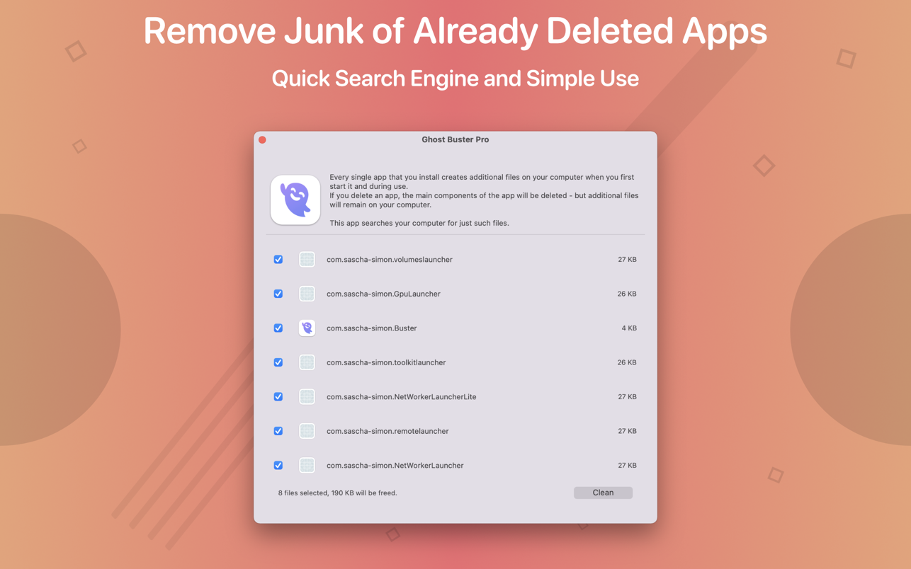 ApplicationApplicationsTools & Utilities Ghost Buster Pro 4.1.2 by mac torrent January 30, 2026 January 30, 2026 ( Ghost Buster Pro 4.1.2 )Loading... Download Ghost Buster Pro finds and deletes files from apps you’ve already uninstalled. The app is lightning fast and frees memory in no time. Many apps are installed on a computer, but they usually only stay on your computer for a short time. Each app creates files, but deleting the app does not remove them. This leads to a large number of files accumulating over time, which take up valuable storage space. Ghost Buster Pro searches your computer for exactly such files and can also delete them directly if you wish. Ghost Buster Pro offers the following features: Fast Search Ghost Buster Pro quickly scans your computer for data from previously deleted apps. You can have them deleted with one click. Extremely easy handling Ghost Buster Pro couldn’t be simpler. The search is started immediately after the app is started. You can now delete files with just one click. No automatic deletion Ghost Buster Pro does not delete any data without your consent. Choose for yourself which data is deleted and which you want to keep. Compatibility: macOS 15.0 or later Mac App Store https://apps.apple.com/app/app-ghost-buster/id1607749385 Screenshots Name: Ghost_Buster_Pro_4.1.2_Mactorrents.Me.dmg Size: 11 MB Files Ghost_Buster_Pro_4.1.2_Mactorrents.Me.dmg[11 MB] Download Torrent Related Posts:Ghost Buster Pro 2.5.1Ghost Buster Pro 2.5.0Ghost Buster Pro 2.4.1Ghost Buster Pro 2.4.0 Download 4.1.2BusterGhostPro 0 comment TwitterRedditTelegramEmail mac torrent MacTorrent - Torrents in Mac. Free Apps, Games & Plugins. Apple Final Cut Pro & Logic Pro X, Adobe Photoshop, Microsoft Office, Pixel Film Studios, previous post JixiPix Artista Impresso Pro 1.8.29 next post zplane elastiquePitch v2.5.0