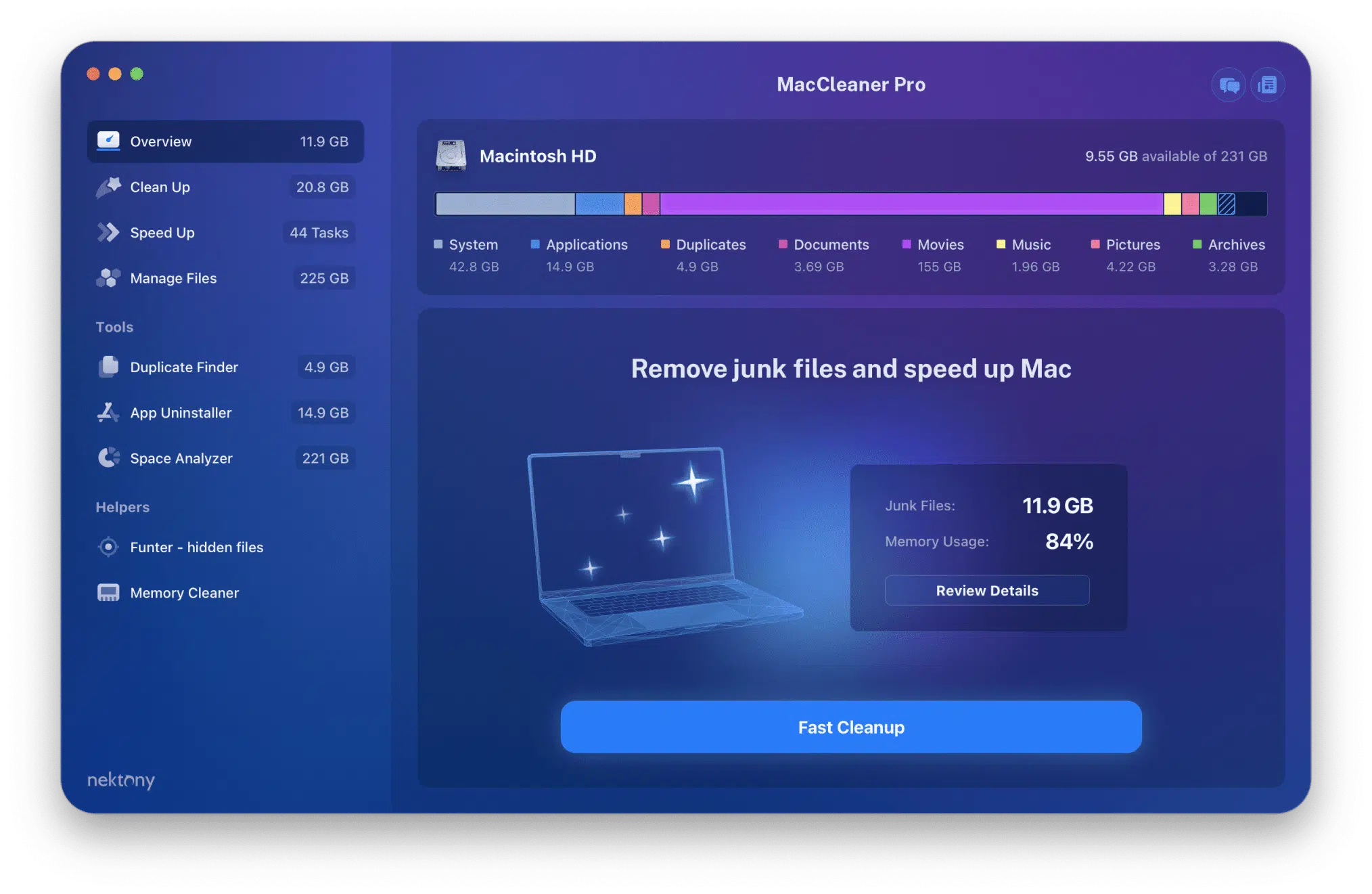 ApplicationApplicationsTools & Utilities MacCleaner 4 Pro 4.0.2 by mac torrent January 27, 2026 January 27, 2026 ( MacCleaner 4 Pro 4.0.2 )Loading... MacCleaner Pro is a Mac optimizer, which will help you to quickly and easily free up space on your Mac and optimize its performance. Just launch any app from the bundle depending on your needs and perform Mac cleanup: Duplicate File Finder – find and remove duplicate files and folder, merge Similar folders. App Cleaner & Uninstaller – uninstall apps completely and safely, manage your extensions. Memory Cleaner – clear inactive RAM memory to get a boost performance. ClearDisk – clear cache and other junk files from your Mac. Disk Expert – analyze your disk space usage and find the bulkiest content. Funter – find hidden files and folders, change your files visibility. What’s New Version 4.0.2: – MacCleaner Pro 4.0 – App Cleaner & Uninstaller 9.0 – Disk Space Analyzer 6.0 – Duplicate File Finder 8.5.1 – Funter 7.1 – Memory Cleaner 5.5 xattr -cr /Applications/App\ Cleaner\ 9.app Compatibility: macOS 10.12 or later Homepage https://nektony.com/ Screenshots Name: MacCleaner_Pro_Bundle_09.01.26_Mactorrents.Me.zip Size: 150.32 MB Files MacCleaner_Pro_Bundle_09.01.26_Mactorrents.Me.dmg[150.32 MB] Download Link Related Posts:MacCleaner 3 Pro 3.2.5MacCleaner 3 Pro 3.2.3MacCleaner 3 Pro 3.2.2MacCleaner 3 Pro 3.2.1 4.0.2MacCleanerPro 0 comment TwitterRedditTelegramEmail mac torrent MacTorrent - Torrents in Mac. Free Apps, Games & Plugins. Apple Final Cut Pro & Logic Pro X, Adobe Photoshop, Microsoft Office, Pixel Film Studios, previous post Money Pro 2.11.22 next post Aiarty Image Enhancer 3.8