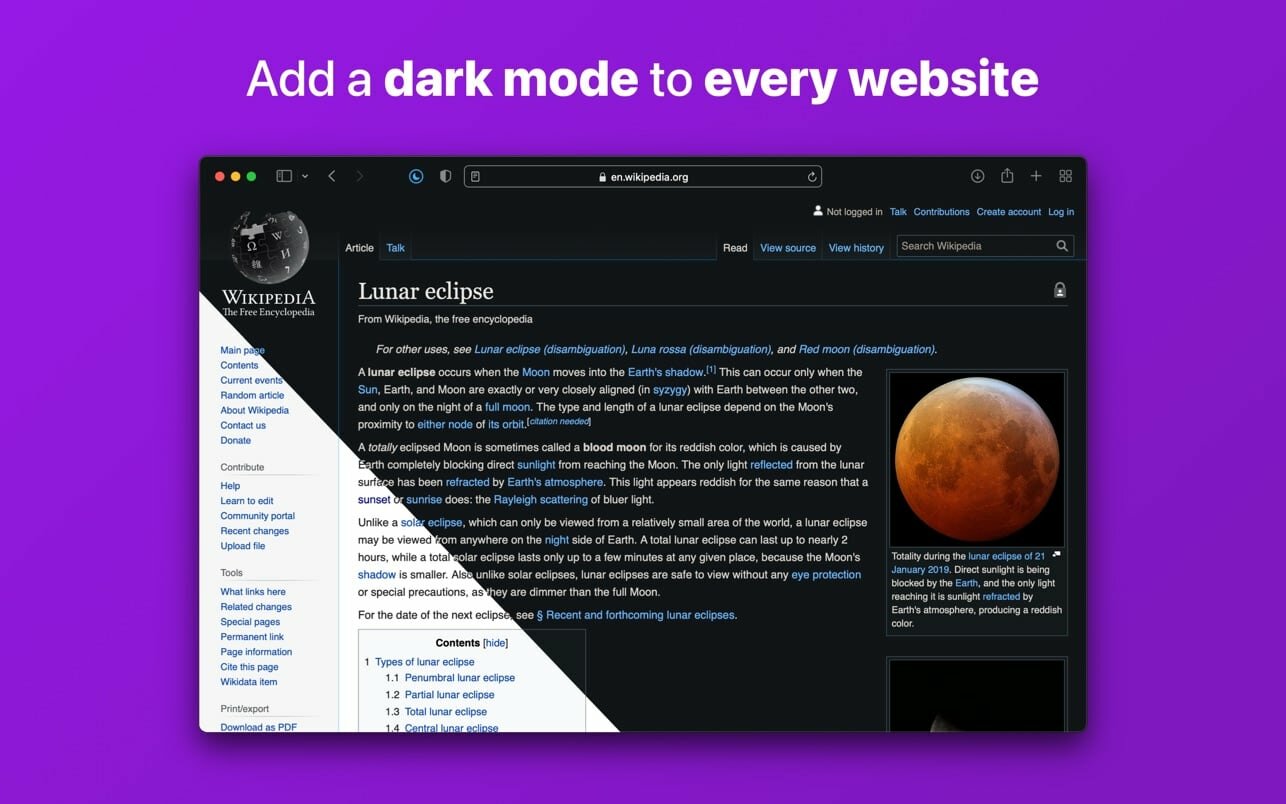ApplicationApplicationsTools & Utilities Noir – Dark Mode for Safari 2026.1 by mac torrent February 24, 2026 February 24, 2026 ( Noir – Dark Mode for Safari 2026.1 )Loading... Download Noir is a Safari extension that automatically adds a dark mode to every website you visit. It makes browsing the web at night so much better. With Noir, you won’t be blinded by bright websites ever again. And the results look great too. Noir generates a custom dark style for each website you visit, based on the colors that are used on a page. You won’t even notice this happening in the background – that’s how fast it is – but you’ll certainly appreciate the end result: a beautiful dark mode tailored for each website, where contrast is preserved and highlights still pop. Noir works with any website you visit in Safari, automatically. By default, Noir is linked to your device’s Dark Mode, so websites will only go dark when you want them to. But you can easily customize this to your liking, even per website. Only want to use Noir on just a few specific websites? Sure thing! Disable Noir on some websites? No problem! The app feels right at home on your device. It is a Safari extension, which means there’s no need to manually activate it every time you load a new page. The app also tightly integrates with system features such as Shortcuts to fully integrate Noir in all your workflows. And your settings are automatically synced to all your devices using iCloud. And just as importantly, Noir takes your privacy seriously: it doesn’t collect any of your browsing data. Period. Compatibility: macOS 12.0 or later Mac App Store https://apps.apple.com/pk/app/noir-dark-mode-for-safari/id1592917505?mt=12&uo=4 Screenshots Name: Noir_2026.1.dmg Size: 12 MB Files Noir_2026.1.dmg [12 MB] Download Torrent Related Posts:Noir – Dark Mode for Safari 2024.1.2Noir – Dark Mode for Safari 2024.1.9Noir – Dark Mode for Safari 2024.1.1Noir – Dark Mode for Safari 2024.2.1 Download DarkModeNoirSafari 0 comment TwitterRedditTelegramEmail mac torrent MacTorrent - Torrents in Mac. Free Apps, Games & Plugins. Apple Final Cut Pro & Logic Pro X, Adobe Photoshop, Microsoft Office, Pixel Film Studios, previous post Sonible puffer:fish v1.0.1