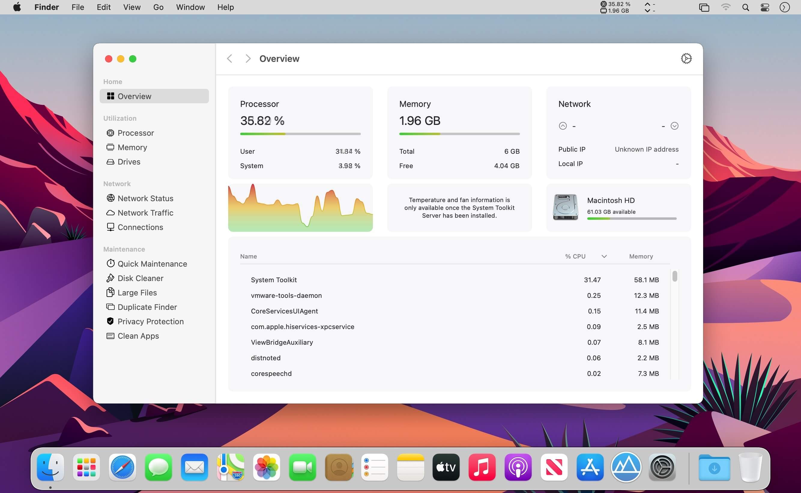 ApplicationApplicationsTools & Utilities System Toolkit 6.2.0 by mac torrent January 29, 2026 January 29, 2026 ( System Toolkit 6.2.0 )Loading... Download The System Toolkit is an all-in-one information and maintenance app designed for macOS. Information: System Information Keep track of all your system loads. This includes CPU load, memory usage, network speeds and -traffic and the open network connections. All information can be shown in both the menu bar extra and the overlay window. Use the Dashboard to take a look at the most important parameters. Menu Bar Extra You can add as many menu bar widgets as you like. Every menu bar widget can be configured to show information. Info Panel The info panel shows the most important information in a separate window. Bluetooth Device Battery Levels The System Toolkit shows the battery levels of Bluetooth devices. The following devices are supported: Peripherals: Apple Magic Mouse Apple Magic Mouse 2 Apple Magic Trackpad 2 Apple Wireless Keyboard Apple Wireless Trackpad Earphones: Apple AirPods Apple AirPods Pro Apple AirPods Max Beats Solo 3 Beats Battery Information You can check the battery parameters on the battery page. This page shows detailed information about the internal battery. If you are using a Mac without battery, this page is hidden. Besides the information pages, the System Toolkit also offers the following maintenance features: Fast Maintenance: Clean your Mac System with a single click! Disk Cleaner The disk cleaner searches your entire hard disk for temporary or cached files that can be deleted to free up some disk space. The categories include application- and user cache, developer cache, browser cache and many more caches. Duplicate Finder Find duplicate files on your system. Use the smart selection to quickly select and delete your duplicate files and free up disk space. Big Files Finder This feature allows you to find big files on your hard disk. Quickly see which files take the most space. The files can be deleted from within the app. Privacy Protector Erase all your private data on your system. Did you visit some website that you do not want your other system users to find out about? Just start the Privacy Protector and erase your footsteps – it cleans the data of all major Werb Browsers. App Cleaner Use the App Cleaner to find and remove files that were created and are being used by an app. Compatibility: macOS 11.0 or later Homepage http://apps.apple.com/app/system-toolkit/id1234854699 Screenshots Name: System_Toolkit_6.2.0_Mactorrents.Me.dmg Size: 10 MB Files System_Toolkit_6.2.0_Mactorrents.Me.dmg[10 MB] Download Torrent Related Posts:System Toolkit 5.11.0System Toolkit 5.10.2System Toolkit 5.10.1System Toolkit 6.1.0 Download 6.2.0SystemToolkit 0 comment TwitterRedditTelegramEmail mac torrent MacTorrent - Torrents in Mac. Free Apps, Games & Plugins. Apple Final Cut Pro & Logic Pro X, Adobe Photoshop, Microsoft Office, Pixel Film Studios, previous post 4K YouTube to MP3 Pro 26.0.1 next post iMediaCut-Easy Video Trimming 8.5.22
