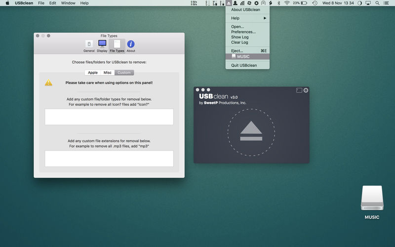ApplicationApplicationsTools & Utilities USBclean 4.5.2 by mac torrent February 3, 2026 February 3, 2026 ( USBclean 4.5.2 )Loading... Download USBclean quickly and easily removes all those pesky junk and ghost files from your external Windows formatted USB drives. .DS_Store, Thumbs.db, .Spotlight, and trashes files take up precious space, and can cause issues on some devices. Remove them all quickly and easily with USBclean. Configure USBclean the way you want! Remove files by dragging your drive into the handy drop zone, from the system menubar, or by dropping straight onto the dock icon. You can easily configure USBclean to run only from the system menubar and open at login. It’s a snap to auto quit after dropping your drive onto the dock icon. USBclean always ejects your drive after cleaning for your convenience. USBclean is useful for: cleaning annoying files which don’t play on your media devices. removal of Mac only files (useful when sharing USB drive with a friends PC). removal of Windows only files which take up useful space removing files of any number of (customizable) filetypes. [for instance, to quickly remove all m4a files from an external drive, go to the “File Types” preference-tab and quickly add “m4a” to the extensions field] Note: Automatic eject is not available for all volume types. Compatibility: macOS 11.0 or later Homepage https://sweetpproductions.com Screenshots Name: USBclean_4.5.2_[TNT]_Mactorrents.Me.dmg Size: 5 MB Files USBclean_4.5.2_[TNT]_Mactorrents.Me.dmg[5 MB] Download Torrent Related Posts:USBclean 3.8.0USBclean 4.3.1USBclean 4.3.0USBclean 4.3.2 Download 4.5.2USBclean 0 comment TwitterRedditTelegramEmail mac torrent MacTorrent - Torrents in Mac. Free Apps, Games & Plugins. Apple Final Cut Pro & Logic Pro X, Adobe Photoshop, Microsoft Office, Pixel Film Studios, previous post ColorWell 8.1.4 next post DockDoor 1.31.2